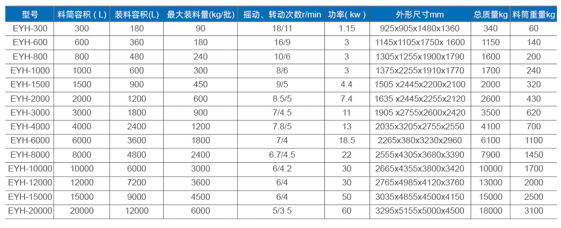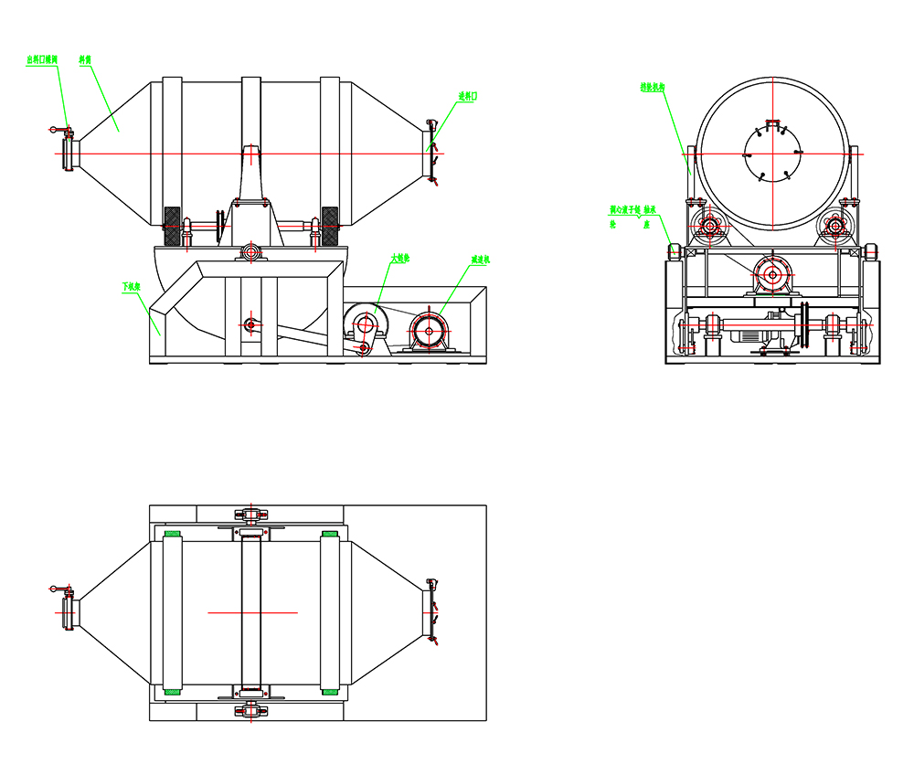 二维混料机主要由转筒、摆动架、机架三大部分组成。转筒装在摆动架上,由四个滚轮支撑并由两个挡轮对其进行轴向定位,另两个转动轮由传动动力系统拖动使转筒产生自转;摆动架由一组曲柄摆杆机构装在机架上,并由轴承组件支撑。二维混料机的转筒可同时进行两个方向运动,一个是转筒的自转,另一个是转简自转的同时随摆动架摆动。被混合物料在转筒内随转筒自转、翻转、混和的同时,又随转筒的摆动而发生左右来回的掺混运动,在这两个运动的共同作用下,物料在短时间内得到充分的混合。