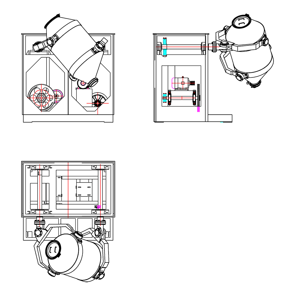 该机在运行时,由于混合桶体具有多方向运转动作,使各种物料在混合过程中加速了流动和扩散作用,同时避免了一般混合机因离心力作用所产生的物料比重偏析和积聚现象,混合无死角,能有效确保混合物料的最佳品质。结构:该机由机座、传动系统、电器控制系统、多向运动机构、混合筒等部件组成。与物料直接接触的混合筒采用优质不锈钢材料制造,桶体内外壁均镜面抛光。